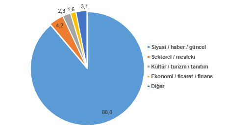 Toplam 2 bin 40 süreli yayının yüzde 88,8’i siyasi, haber, güncel, yüzde 4,2’si sektörel, mesleki, yüzde 2,3’ü kültür, turizm, tanıtım, yüzde 1,6’sı ekonomi, ticaret, finans içerikli yayımlanırken, yüzde 3,1’i ise diğer içerik türlerinde çıktı.