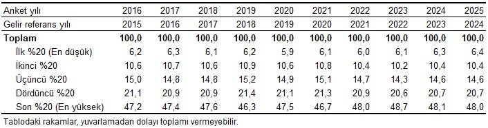 TÜİK’e göre en zengin yüzde 20’nin payı bir önceki yıla göre 0,1 puan geriledi; en yoksul yüzde 20’nin payı 0,1 puan arttı. Ancak tablo, küçük oynamalara rağmen büyük farkı kapatmadı.