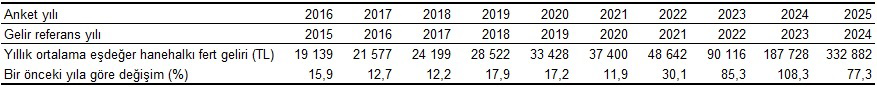 Yıllık ortalama eşdeğer hanehalkı kullanılabilir fert geliri ve bir önceki yıla göre değişim, 2016-2025