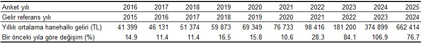 Yıllık ortalama hanehalkı kullanılabilir geliri ve bir önceki yıla göre değişim, 2016-2025