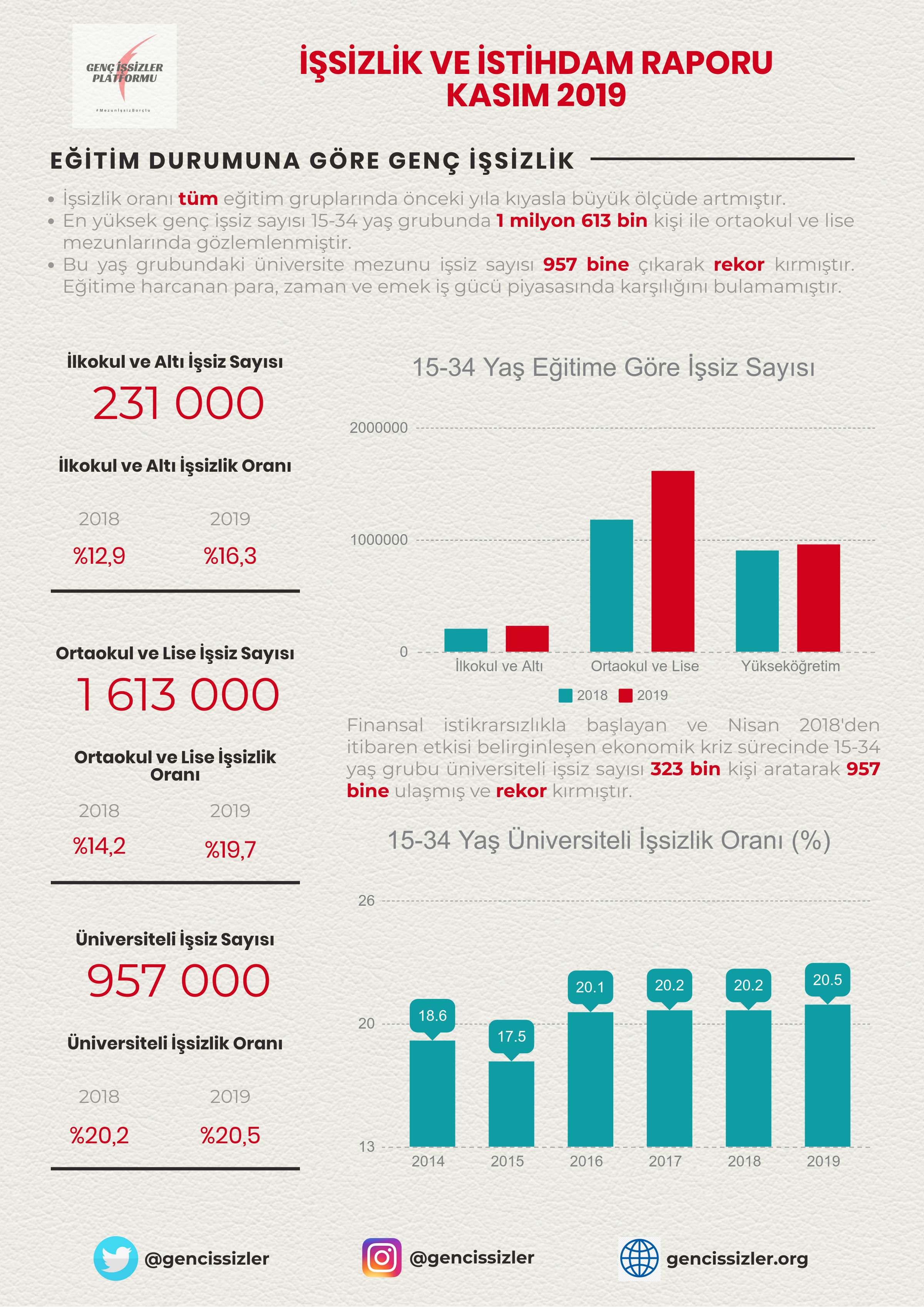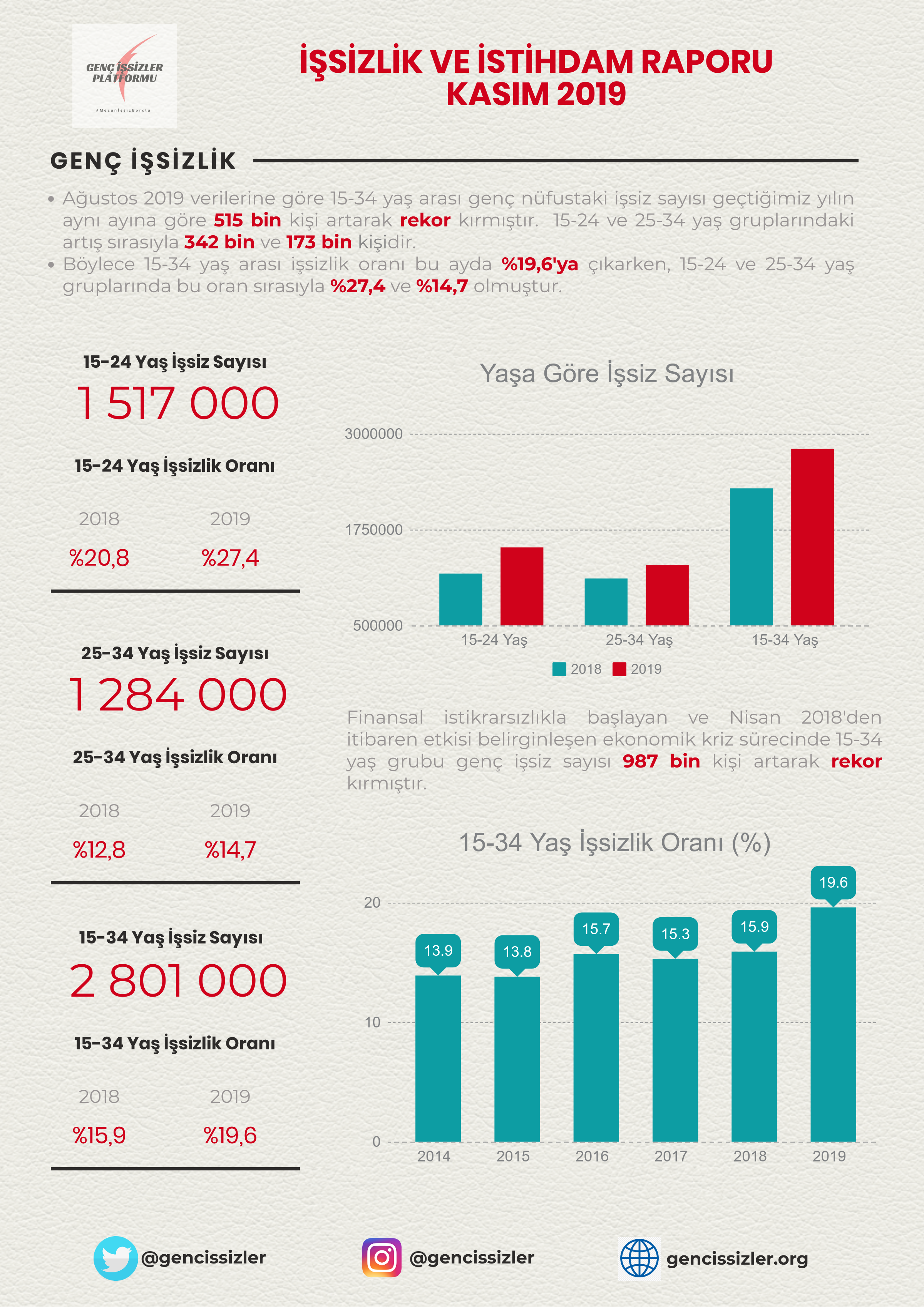 Genç İşsizler Platformu’nun son açıklanan TÜİK ve İŞKUR verilerinden derleyerek hazırladığı ‘Kasım 2019 İşsizlik ve İstihdam Raporu’na göre 15-34 yaş arasını kapsayan genç işsiz sayısı geçtiğimiz yılın aynı ayına göre 515 bin kişi artarak 2 milyon 801 bin kişiye ulaştı.
