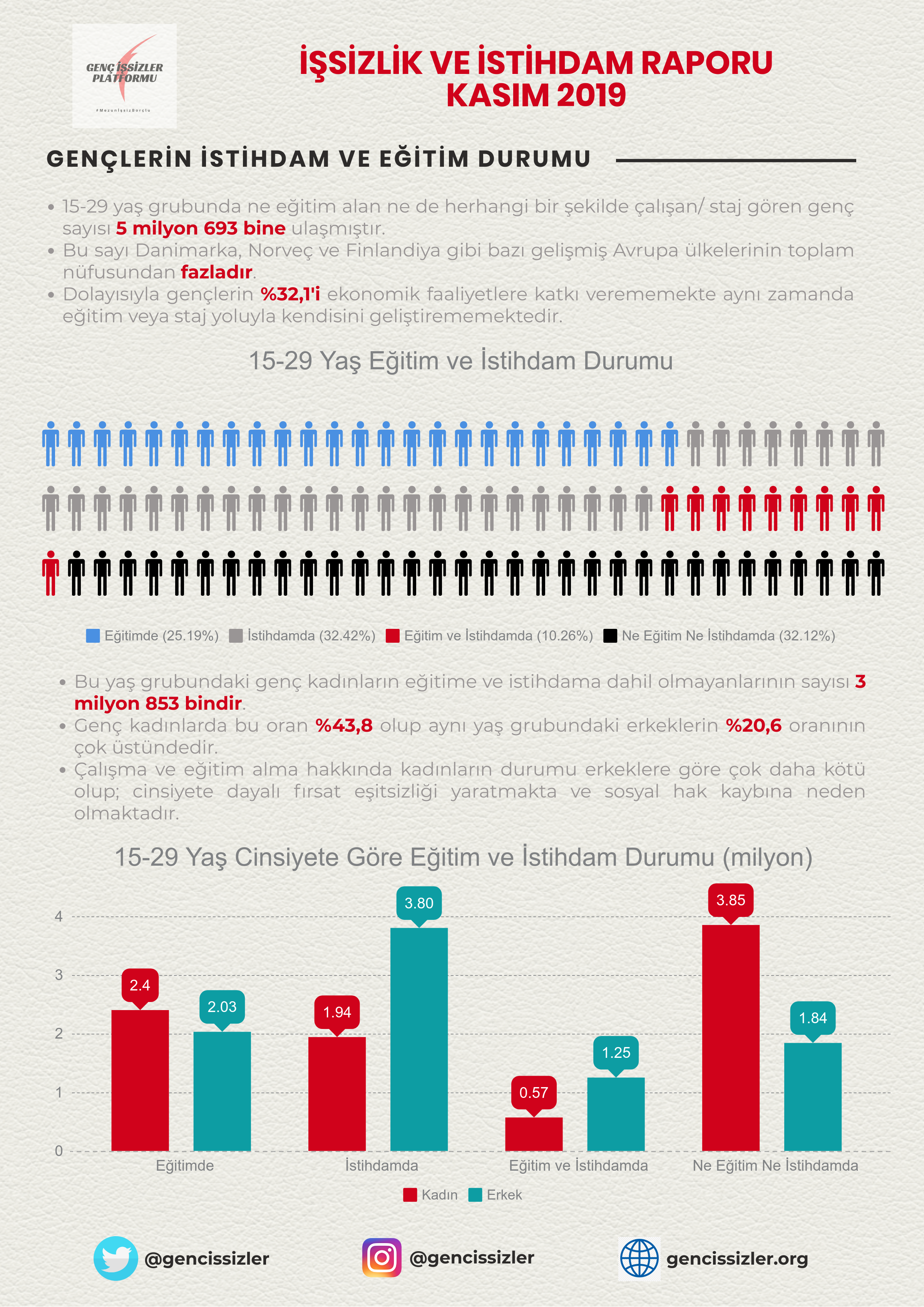 Yine bu dönemde 15-29 yaş grubunda ne eğitim alan ne de herhangi bir şekilde çalışan / staj gören genç sayısının 5 milyon 693 bine ulaştığı belirtilen raporda “Gençlerin yüzde 32,1'i ekonomik faaliyetlere katkı verememekte aynı zamanda eğitim veya staj yoluyla kendisini geliştirememektedir. Bu kategorideki genç sayısı Danimarka, Norveç ve Finlandiya gibi bazı gelişmiş Avrupa ülkelerinin toplam nüfusundan fazladır” ifadeleri kullanıldı.