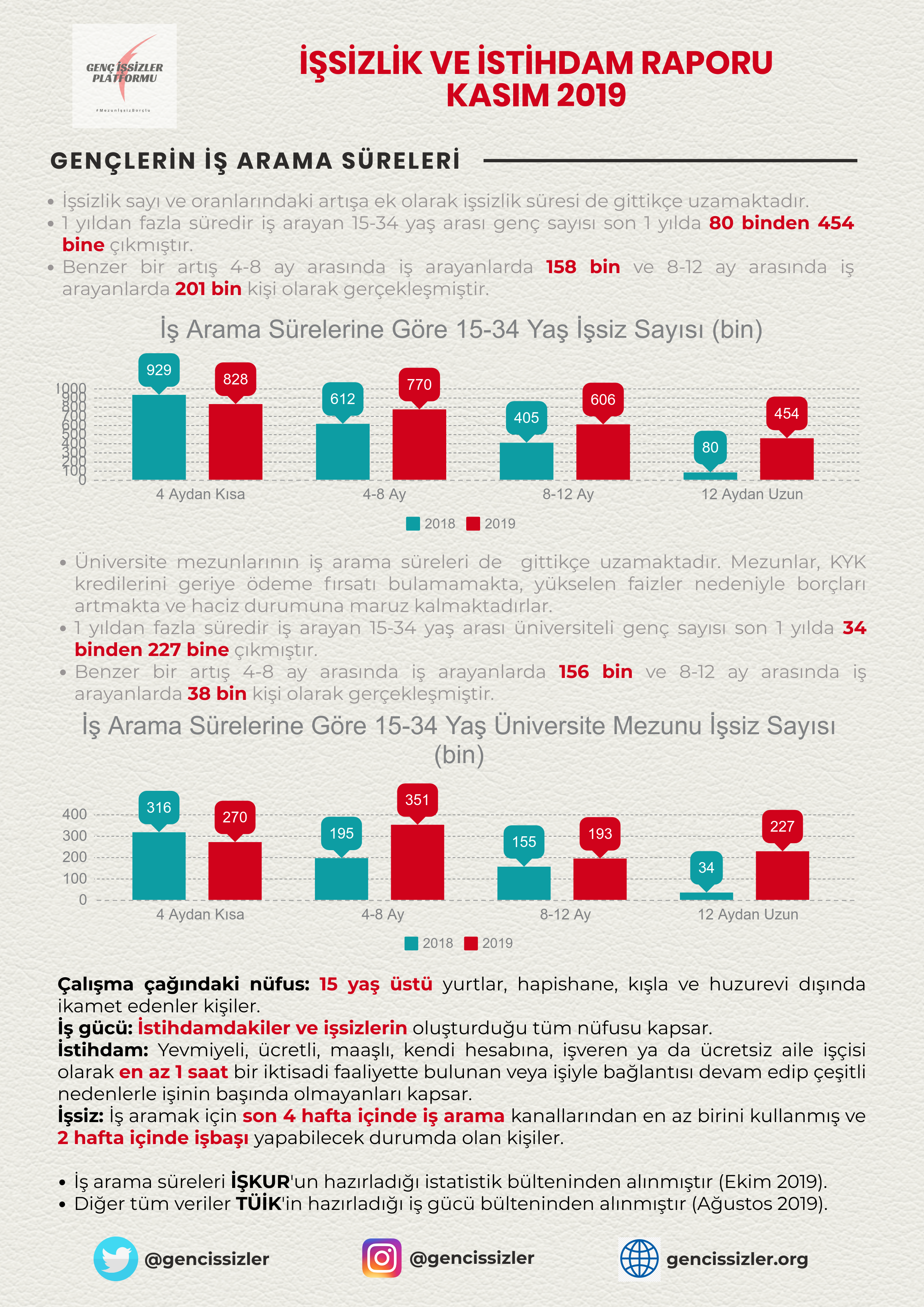 İşsizlik sayı ve oranlarındaki artışa ek olarak işsizlik süresinin de gittikçe uzaması da raporda kendine yer buldu. Bir yıldan fazla süredir iş arayan 15-34 yaş arası genç sayısı son 1 yılda 80 binden 454 bine çıktı.