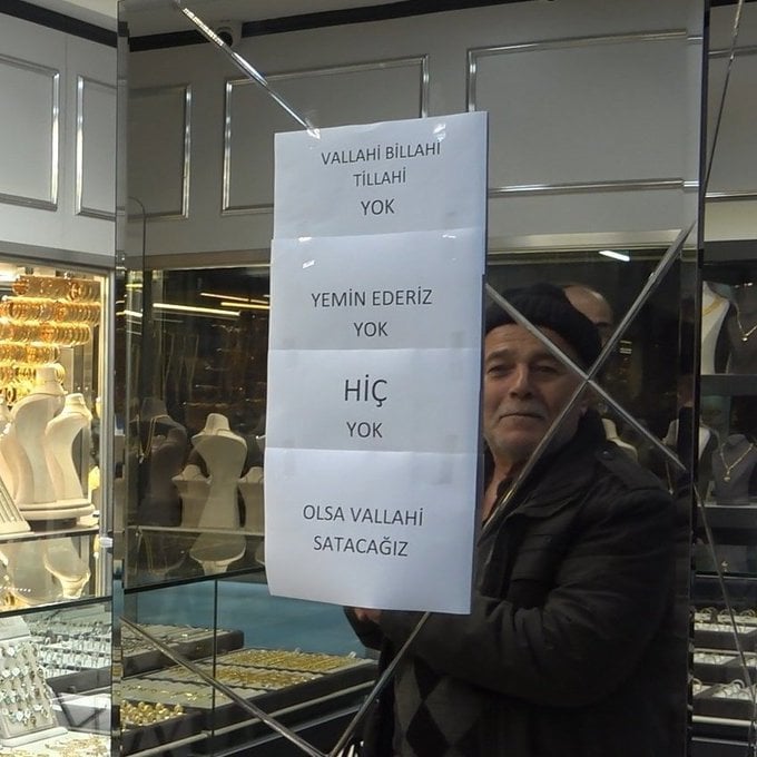 In Bursa, one jeweller hung a sign on his window to convince skeptical customers, which read: "We swear to God we don't have gold. Not at all. If we had, we would sell it."