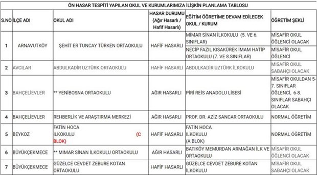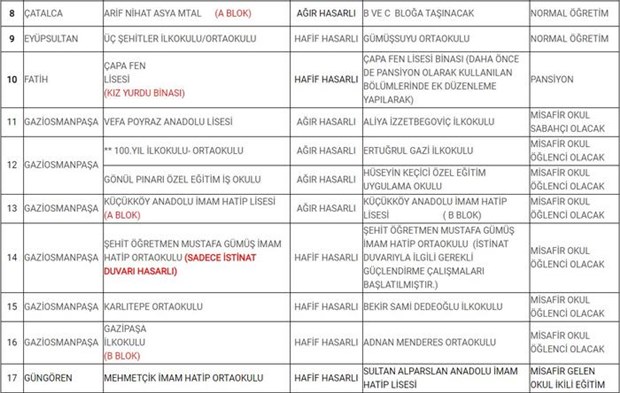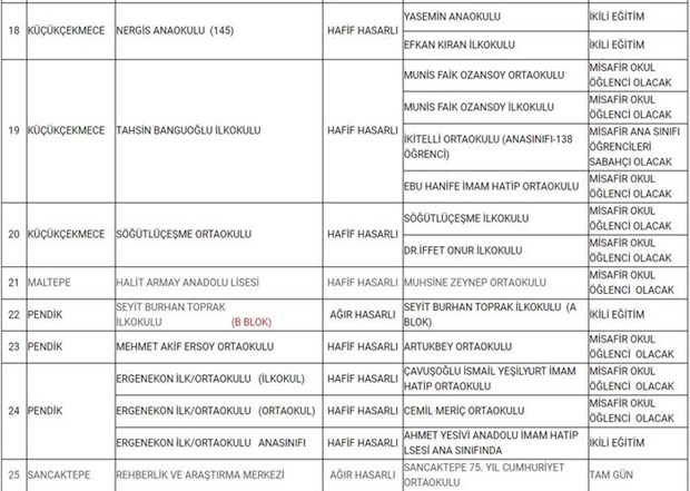 Açıklamada, 1 Ekim'den itibaren risk nedeniyle kendi okullarında eğitim göremeyecek öğrencilerin hangi okullarda eğitim göreceğine ilişkin liste paylaşıldı.