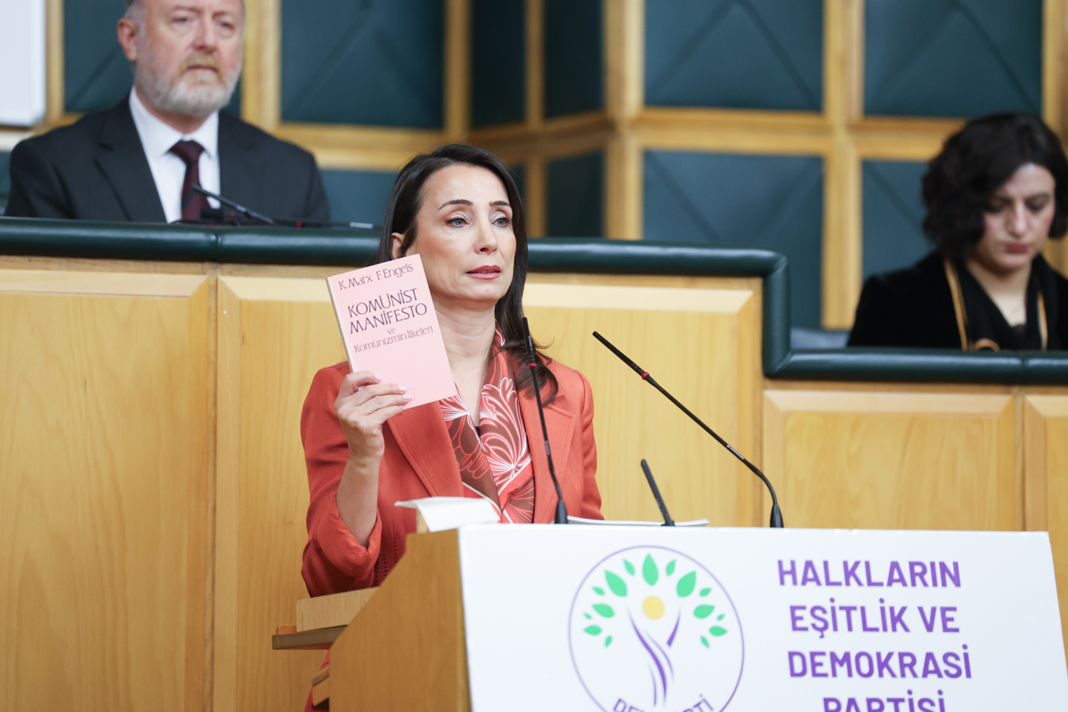 “Bileşen partimiz, Ezilenlerin Sosyalist Partisi’ne yönelik yapılan siyasi operasyonda 96 kişi gözaltına alındı. Bir dosyadan 77 insan tutuklandı. O büyük büyük gazete manşetlerinde tırnak içinde terör yaftası yapıştırmaya çalışanlar şimdi söyleyeceğimi dikkatle dinlesinler. Umarım biraz hicap duyarlar bundan. Ne ile suçlanıyorlar biliyor musunuz? Çocuk emeğini sömüren MESEM’lere karşı yaptıkları eylemler, Suruç Katliamı için anma düzenleme, Che Guevara posteri bulundurma, adliyede görülen toplumsal davaları takip etme. Bunları suç olarak addetmişler. Ha bir de suç sayılan bir kitap var: Komünist Manifesto. Komünist Manifesto; kapitalizme karşı işçinin, emekçinin, yoksulun, ezilenin, sömürülenin hakkını savunan bir ideolojiyi anlatıyor. Bu kitap hepimizin kütüphanesinde var. Bu kitap dünyada en çok okunan kitaplardan. Bunu suç sayanlara öneriyoruz. Bu kitabı alın, hakkıyla okuyun. Belki gücün değil; ezilenin, sömürülenin yanında olmanız gerektiğinin idrakine varırsınız. Bu kitap suç değildir.”