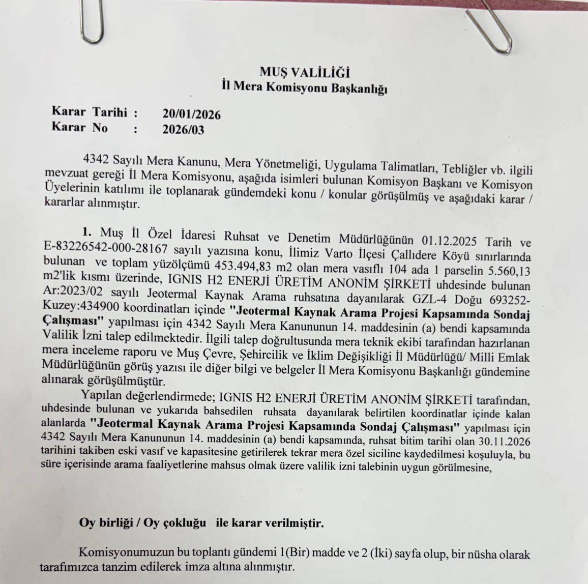 Muş Valiliği İl Komisyon Başkanlığı, Mûş’un Gimgim (Varto) ilçesini kapsayan, toplam yüz ölçümü 453 bin 494.83 metrekare olan mera vasıflı alanın 5 bin 560.13 metrekarelik kısmı üzerinde, IGNIS H2 Enerji Üretim Anonim Şirketi tarafından, “Jeotermal kaynak arama projesi kapsamında sondaj çalışması” yapılmasına onay verdi.