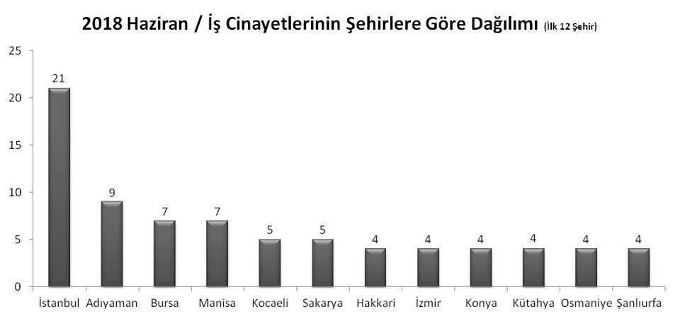 * Haziran’da Türkiye’nin 50 şehrinde iş cinayeti gerçekleşti. En çok iş cinayeti İstanbul, Adıyaman, Bursa, Manisa, Kocaeli, Sakarya, Hakkari, İzmir, Konya, Kütahya, Osmaniye ve Şanlıurfa’da yaşandı.