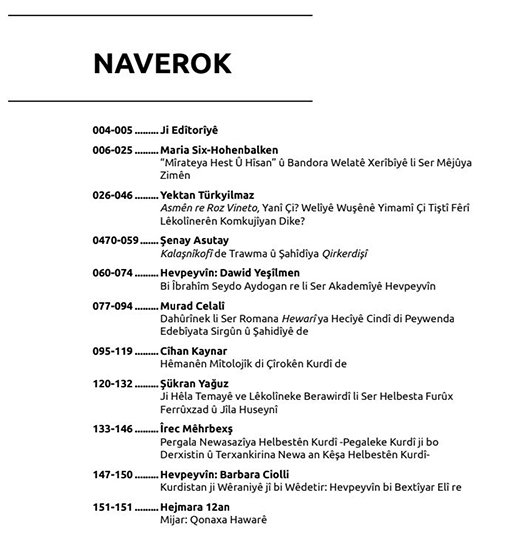 “Heypeyvîna vê hejmarê, Dawid Yeşilmen bi Îbrahîm Seydo Aydogan re li ser akademîyê kir. Seydo, di hevpeyvîna xwe de li ser akademîya kurdî fikrê xwe tîne zimên û tecrûbeyên Inalcoyê bi xwendevanên me re parve dike. Murad Celalî, di nivîsara xwe ya li ser Hewarîya Hecîyê Cindî de bi nêrîneke li dor temayên edebîyata şahidî û sirgûnê romanê dinirxîne. Cihan Kaynar, bi nivîsa xwe ve, hêmanên mîtolojîk ên di çîrokên kurdî de lêdikole. Şükran Yağuz jî bi nêrîneke berawirdî ve temayên di helbestên Furûx Ferrûxzad û Jîla Huseynî dide ber hev û wekhevîyên balkêş destnîşan dike. Îrec Mêhrbexş pergaleke nû ya bi navê Newasazîyê berpêş dike û amaje pê dike ku ev pergal xweştir li bejn û bala kurdîyê tê. Me xwest bi rêya kovara me, ev mijar bi raya giştî re bête parvekirin û nîqaşkirin. Kurtehevpeyvîneke ku nivîskareke îtalî bi Bextîyar Elî re kirîye, ji îtalî bo kurmancî ji alîyê Selîm Nalî Gulfiraz ve hate wergerandin.