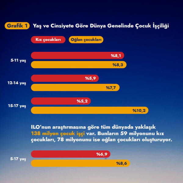 Raporda, Uluslararası Çalışma Örgütü'nün (ILO) yaş ve cinsiyete göre araştırdığı çocuk işçiliğine ilişkin veriler de yer aldı.