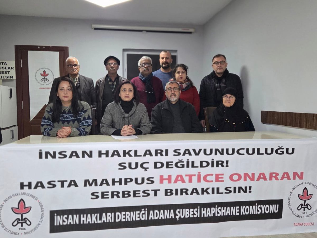 İHD Adana Şubesi, hasta tutsak Hatice Onaran'a dair dernek binalarında açıklama yaptı. "İnsan hakları savunuculuğu suç değildir. Hasta mahpus Hatice Onaran serbest bırakılsın" yazılı pankartın açıldığı açıklamada ortak basın metnini İHD Adana Şube Başkanı Yasemin Dora Şeker okudu. Hatice Onaran'ın durumuna dikkat çeken Yasemin Dora Şeker, "Hatice Onaran derhal serbest bırakılsın. Hasta mahpuslara özgürlük" dedi.
