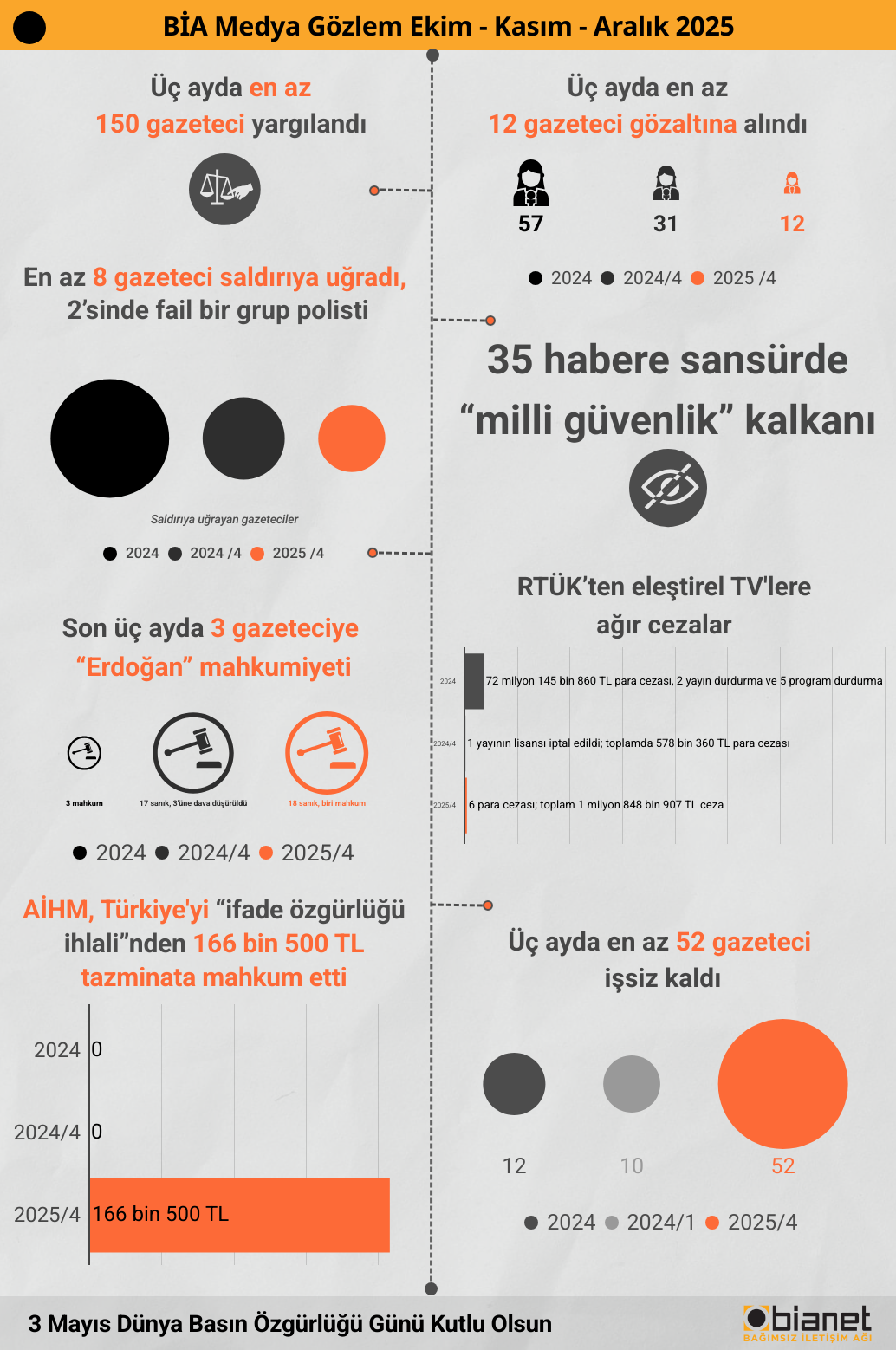 Ekim - Aralık 2025 dönemini kapsayan BİA Medya Gözlem Raporu, iktidar makamlarının LeMan dergisi, Fatih Altaylı, Merdan Yanardağ ve Enver Aysever örnekleri gibi, yargıya müdahale oluşturan çıkışlarının Ruşen Çakır ve Barış Terkoğlu gibi güvenilir yüzlerinin keyfi şekilde gözaltına alınmasıyla devam ettiğini, başkanı değişse de RTÜK’ün eleştirel kanalları zayıflatmaya dönük para cezalarına başvurmayı sürdürdüğünü gözler önüne seriyor.