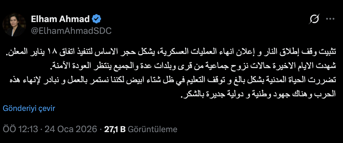 Kuzey ve Doğu Suriye Özerk Yönetimi Dış İlişkiler Dairesi Eş Başkanı İlham Ahmed, 18 Ocak Anlaşması ve sahadaki insani duruma ilişkin açıklama yaptı.