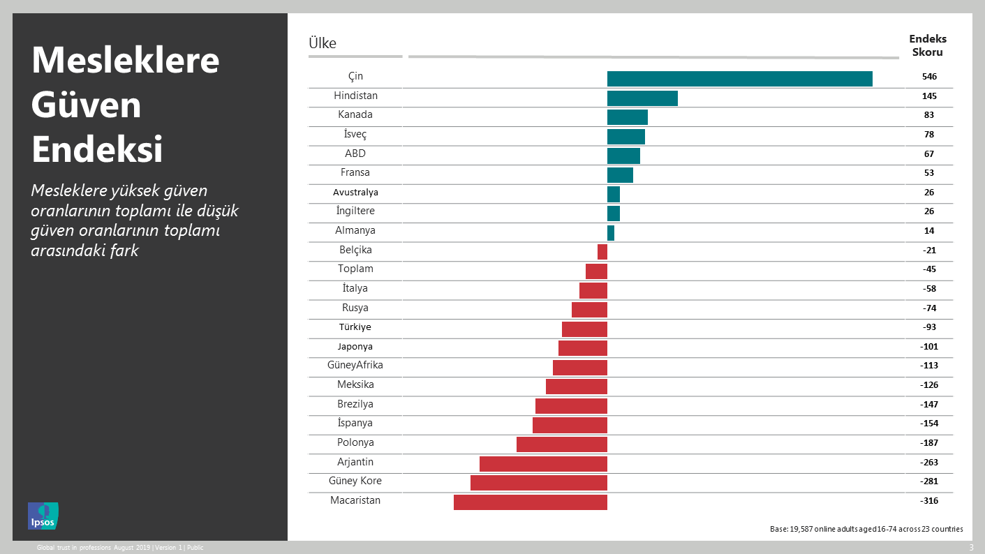 Buna göre araştırmaya Türkiye'den katılanların güvendiği meslekler arasında ilk üç sırada bilim insanları, doktorlar ve öğretmenler yer aldı. Son iki sırayı ise din görevlileri ve siyasetçiler oluşturdu.