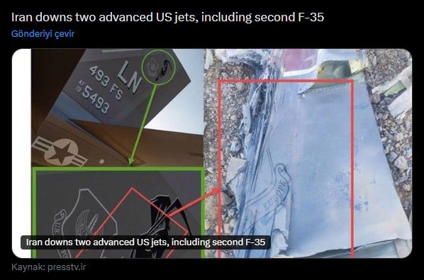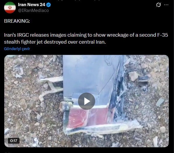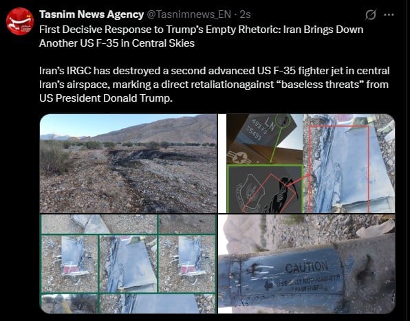 İran Devrim Muhafızları Ordusunun açıklamasında, "Amerikan yapımı gelişmiş bir F-35 savaş uçağı, İran Devrim Muhafızları Ordusunun gelişmiş hava savunma sistemi tarafından İran'ın orta semalarında imha edildi." denildi.