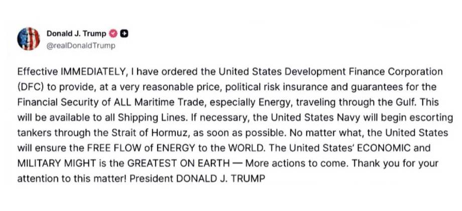 ABD Başkanı Donald Trump, Körfez’den geçen tüm deniz ticaretinin özellikle de enerjinin finansal güvenliği için çok makul bir bedelle siyasi risk sigortası ve teminat sağlanması talimatı verdiğini, gerekirse ABD donanmasının Hürmüz Boğazı’ndan geçen tankerlere refakat etmeye başlayacağını açıkladı.