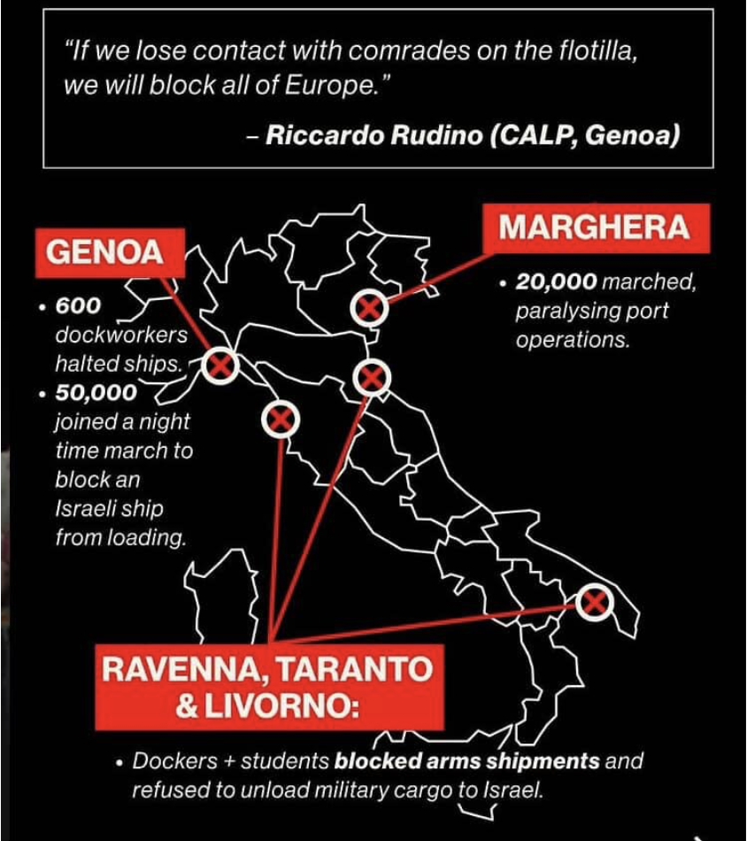 İsrail’in Gazze’ye yönelik saldırıları ve ablukasının yanı sıra 24 Eylül 2025 tarihinde Küresel Sumud Filosu’na yapılan müdahale nedeniyle, taban sendikaları Giorgia Meloni hükümetinin soykırıma karıştığı iddiasıyla genel grev çağrısında bulundu.