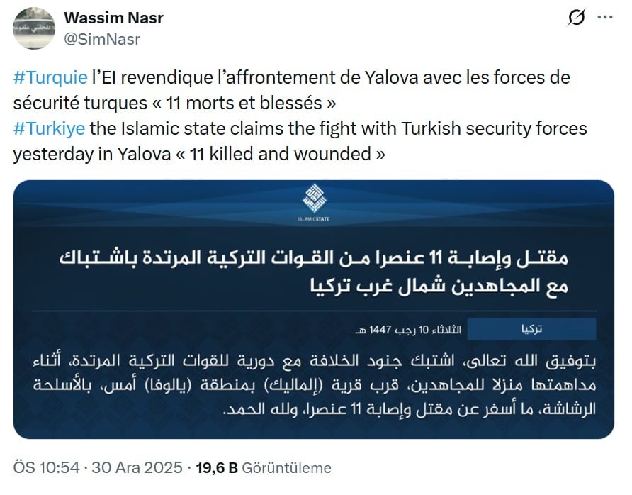 Gazeteci Wassim Nasr, örgütün açıklamasını, “IŞİD, Yalova’da Türk güvenlik güçleriyle yaşanan çatışmanın sorumluluğunu üstlendi” notuyla X hesabında paylaştı.