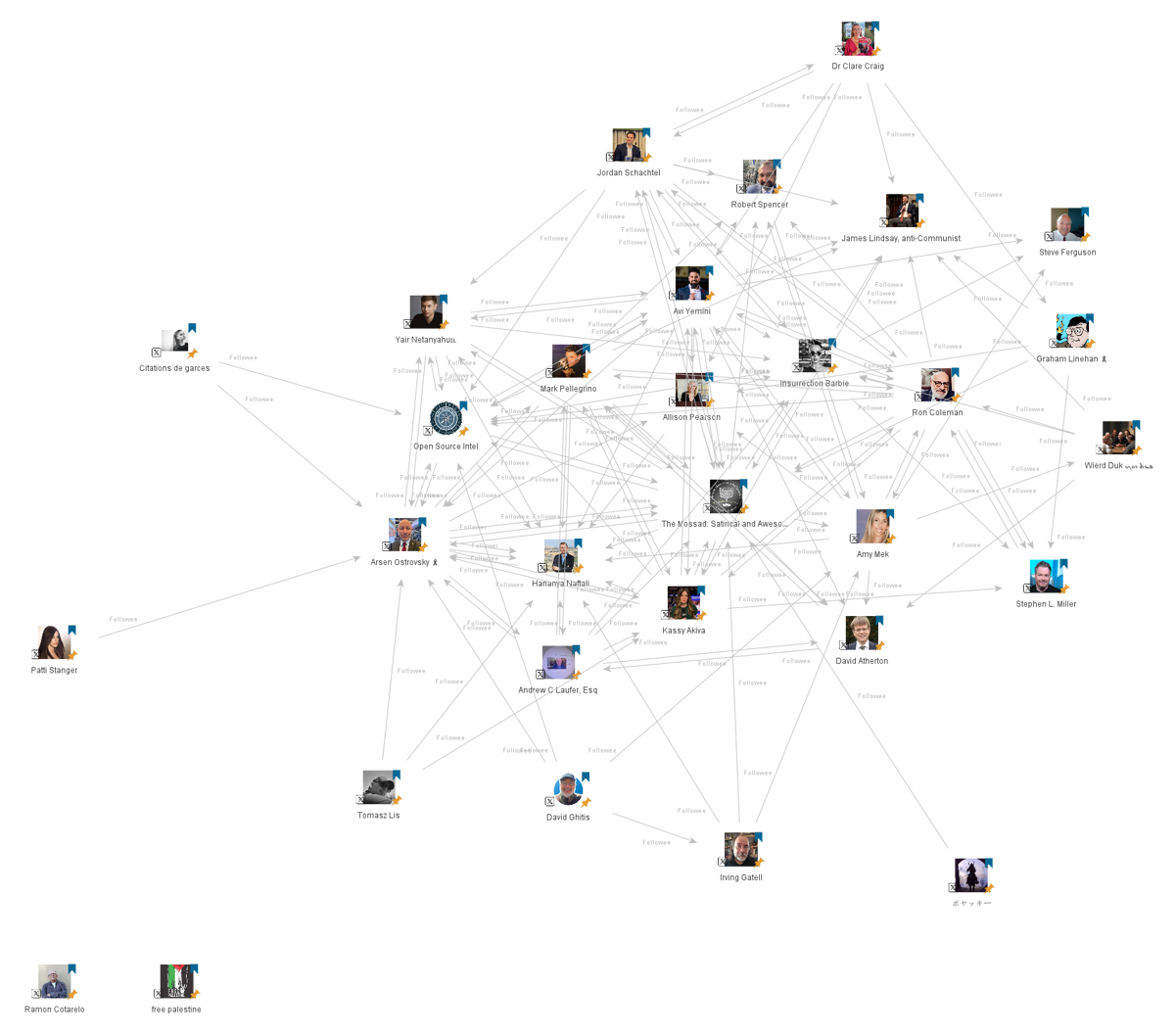 1 Ocak - 9 Nisan 2025 tarihleri arasında Gazawood içeriği paylaşan en etkili 30 X hesabının haritası