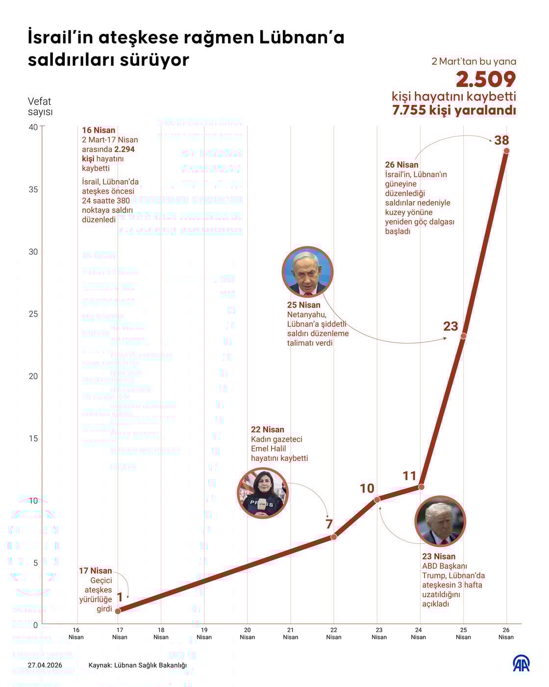 ABD Başkanı Donald Trump, Lübnan ile İsrail arasında 17 Nisan’da yürürlüğe giren 10 günlük geçici ateşkesin 3 hafta daha uzatıldığını duyurmuştu.