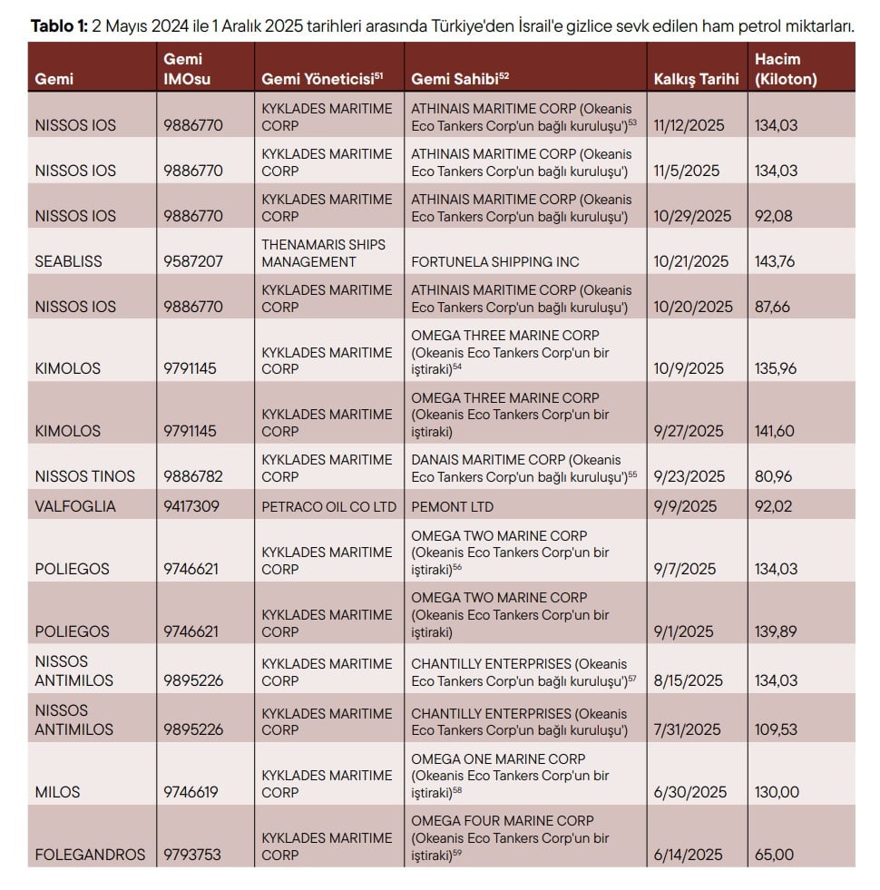 Raporda, Türkiye’nin İsrail’e yönelik ticaret ambargosuna rağmen Yunanistan merkezli iki şirketin Ceyhan üzerinden petrol sevkiyatını sürdürdüğü belirtildi:
