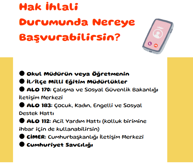 Çocukların uğrayabileceği tehlikeli işlerde çalıştırılmak, koruyucu ekipman verilmemesi, sadece iş yaptırılıp meslek öğretilmemesi, fiziksel, psikolojik veya sözlü şiddet, ücretsiz veya eksik ücretle çalıştırılmak, mola hakkının tanınmaması ve ayrımcılık gibi sık karşılaşılan hak ihlallerinin tanımlandığı rehberde; “Çocuklar bu hak ihlalleriyle karşılaştığında nereyi aramalı?” sorusunun cevabı da bulunuyor.