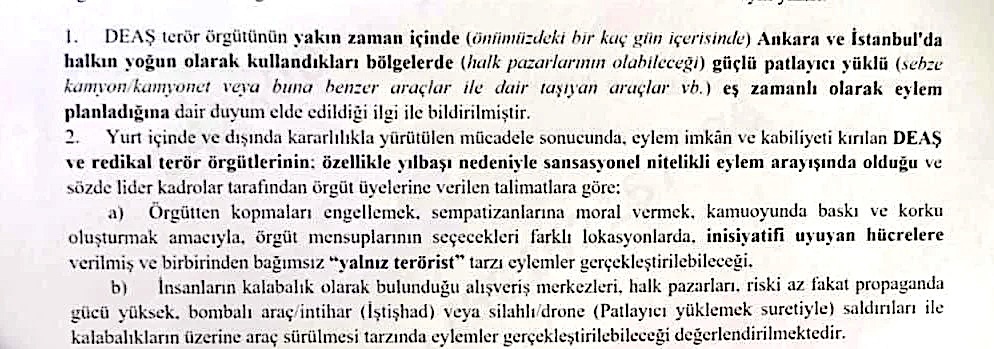Yeni yıl yaklaşırken, Ankara İl Jandarma Komutanlığı, olası IŞİD terör saldırısına karşı personelini ve ilgili birimleri uyardı. 19 Aralık tarihli yazıda Ankara ve İstanbul’a işaret edildi.