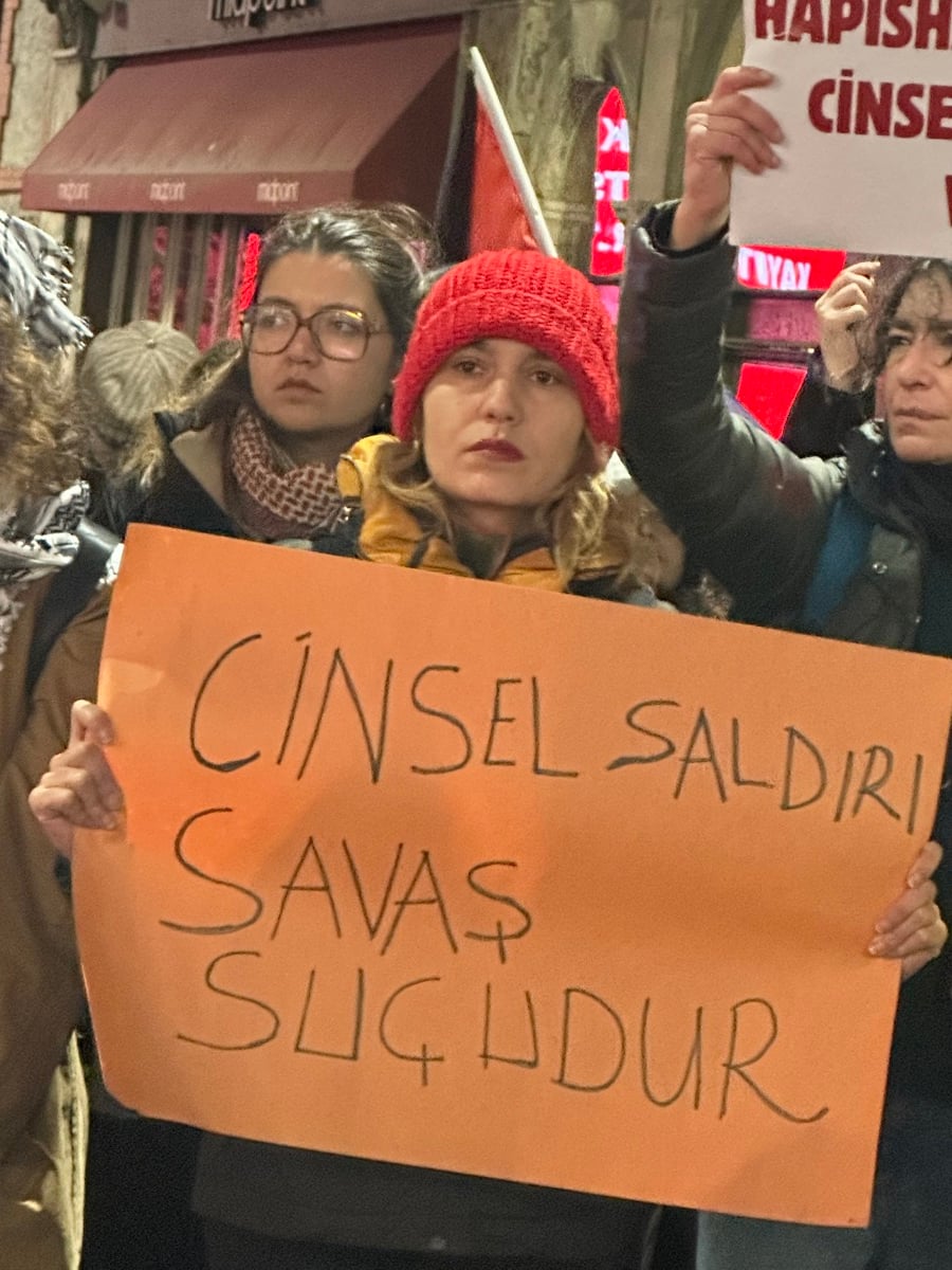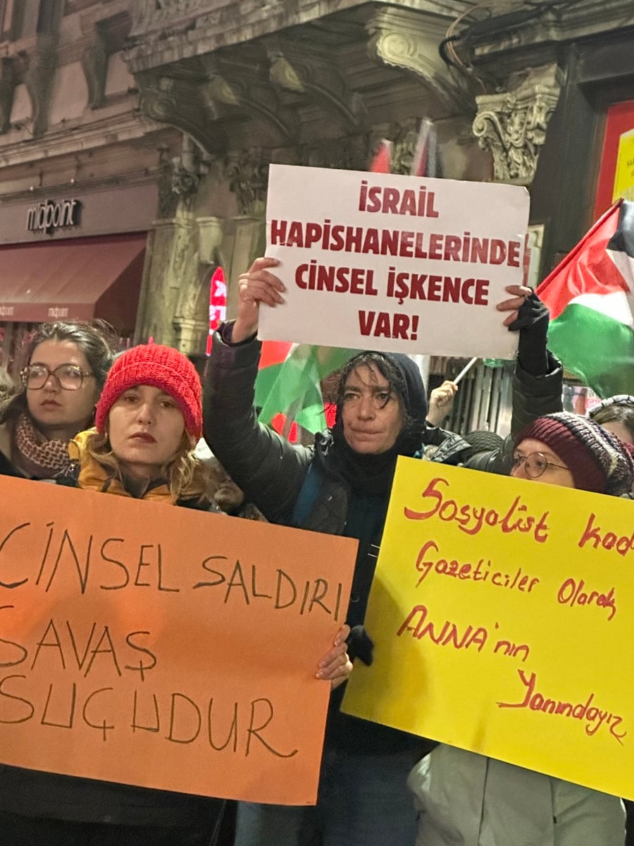 Eylem, “Gözaltında ve hapishanelerde cinsel şiddete son”, “İsrail’le askeri, siyasi, kültürel ve akademik tüm ilişkiler kesilsin”, “Filistinli kadınlara özgürlük” ve “Nehirden denize özgür Filistin” sloganlarıyla sona erdi.