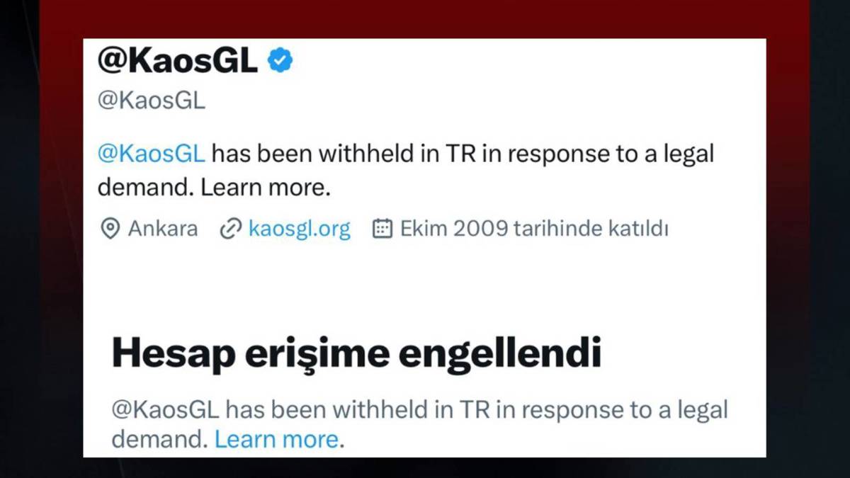 "Kaos GL Derneği bünyesinde yayın hayatını sürdüren KaosGL.org internet gazetemize ait X (eski adıyla Twitter) hesabımız Türkiye’den erişime engellendi. 47 bin 500 takipçili @kaosgl hesabımıza Türkiye’den okurlarımız ulaşamıyor.