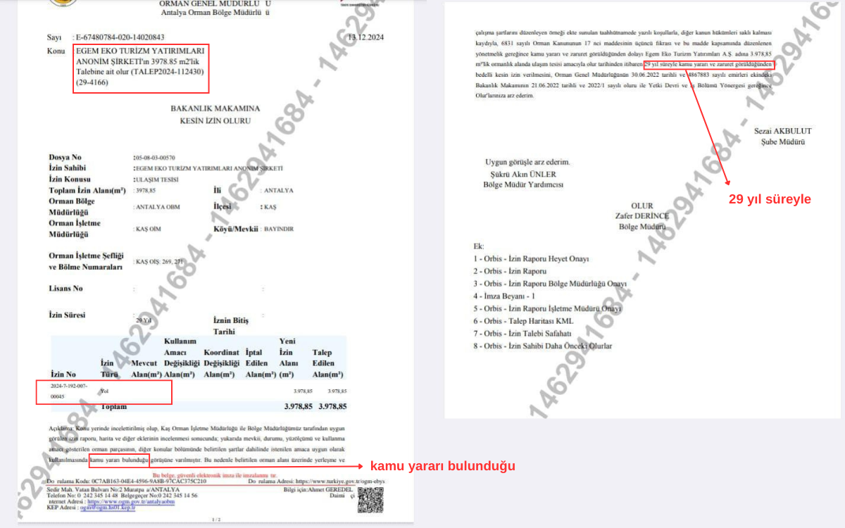 bianet’e konuşan Kaş Çevre ve Kültür Derneği Başkanı Ahmet Murat Akoy, Antalya Orman Genel Müdürlüğü’nün (OGM) yol yapımı için izin verdiğini ve gerekçenin kamu yararı olduğunu aktardı.