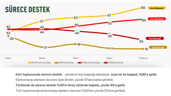 Kürt Çalışmaları Merkezi'nin anketine göre, sürece destek Kürtlerde yüzde 80 iken Türklerde yüzde 60.