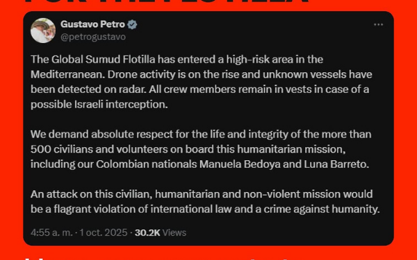 13:30 | Kolombiya Cumhurbaşkanı Gustavo Petro, İsrail'in ablukasını kırmak için Gazze'ye doğru hareket eden Küresel Sumud Filosu'na yönelik bir saldırının "uluslararası hukukun bariz ihlali ve insanlığa karşı suç" olacağını belirtti.