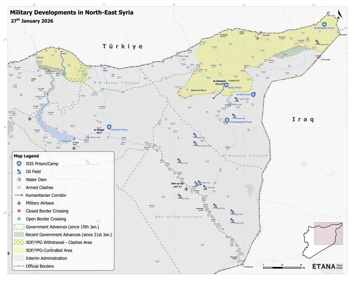 Kuzeydoğu genelinde dört günlük ateşkes korundu; 24 Ocak’a kadar cephe hatları büyük ölçüde sabit kaldı. Haseke vilayeti ve çevresinde taraflar, ateşkes dönemini cephe hattındaki birliklerini takviye etmek için kullandı. Bu durum, çatışmaların yeniden başlamasına hazırlık ya da müzakere pozisyonlarını güçlendirme amacı taşıyor olabilir.