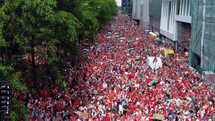 Avrupa Birliği'nin başkenti Brüksel de Gazze’ye destek eylemlerinin merkezlerinden biri oldu. Yerel saatle 13.00’te Kuzey Tren İstasyonu’nda buluşan on binlerce kişi, kırmızı kıyafetleriyle “İsrail'e karşı kırmızı çizgi çekin” mesajı verdi. “Gazze’de tüm kırmızı çizgiler aşıldı” diyen kalabalık, Avrupa hükümetlerine İsrail'e karşı yaptırım uygulama çağrısında bulundu.