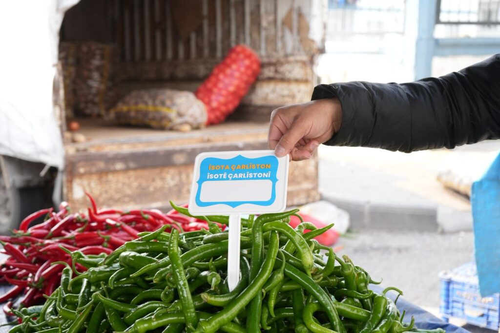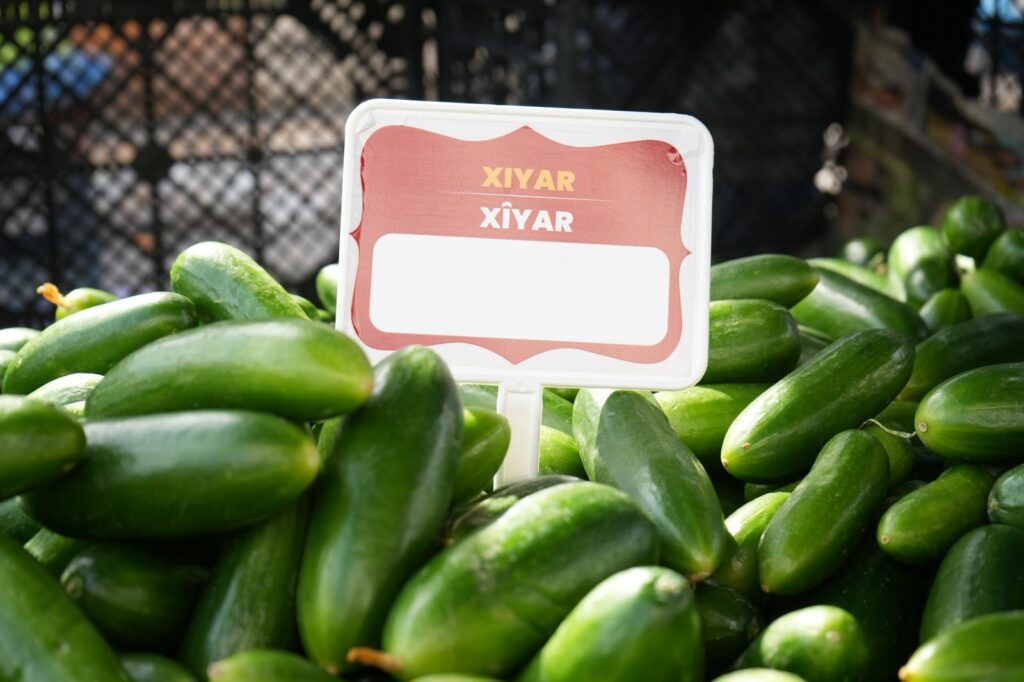 Di nav wan de etîketên biha û navên sebzeyan bi Kurdî (Kurmancî û Kirmanckî), her wiha tabelayên deriyan ên bi nivîsên “Vekirî – Girtî” û “Bi xêr hatin” jî hebûn û li dikan û kargehan hatin daliqandin.