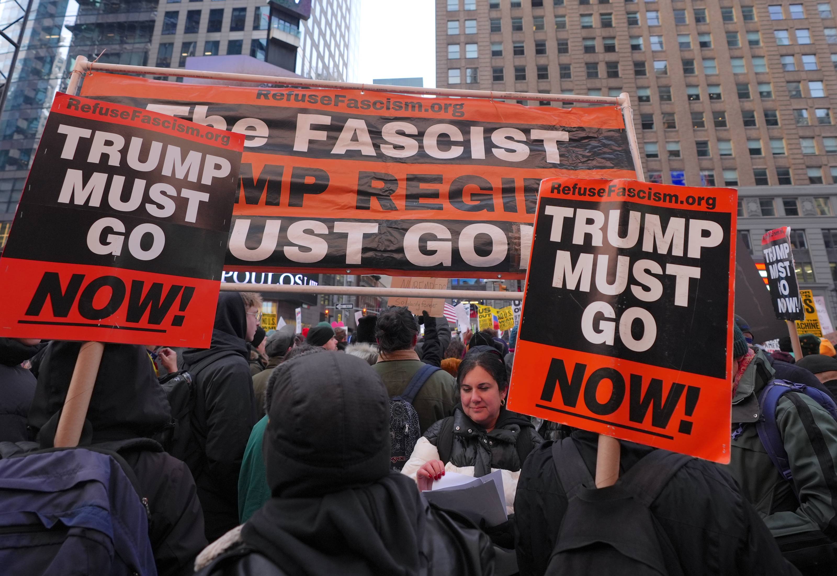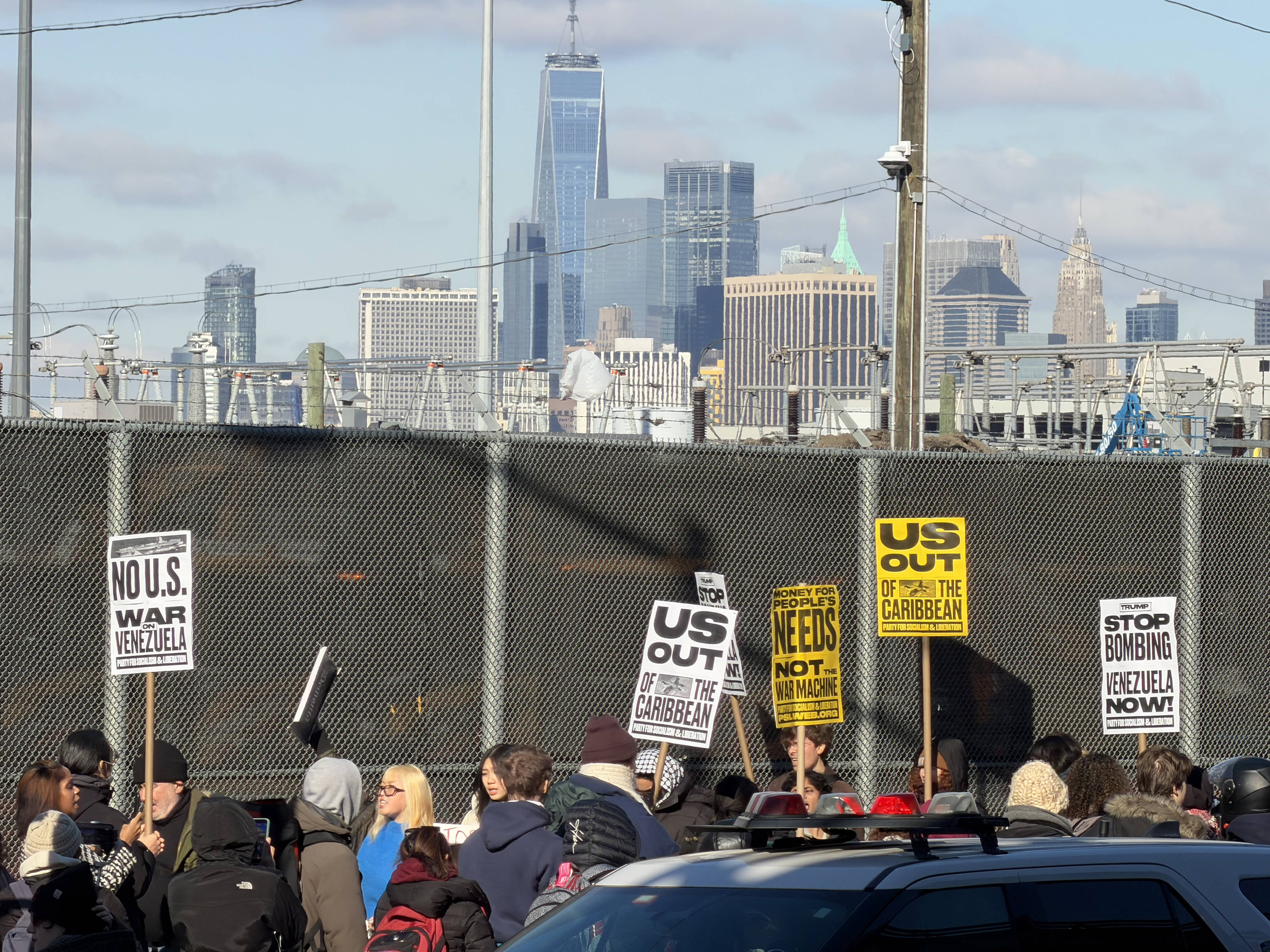 Göstericiler, "Petrol için kan dökülmesin", "Bu savaş yasal değil", "ABD ellerini Latin Amerika'dan çek" ve "Kongre, Trump'ın savaşını durdur" yazılı pankartlar taşıdı.