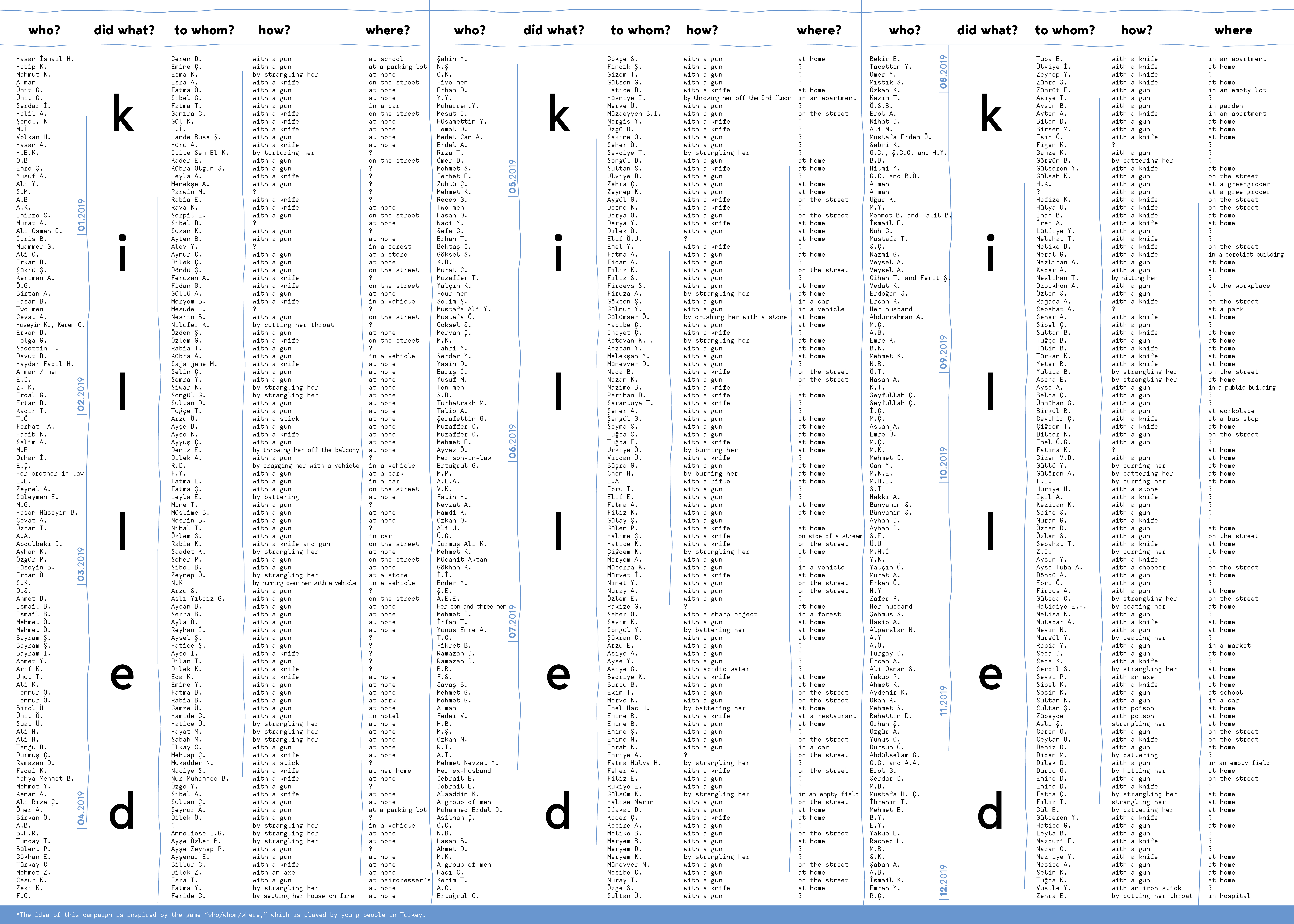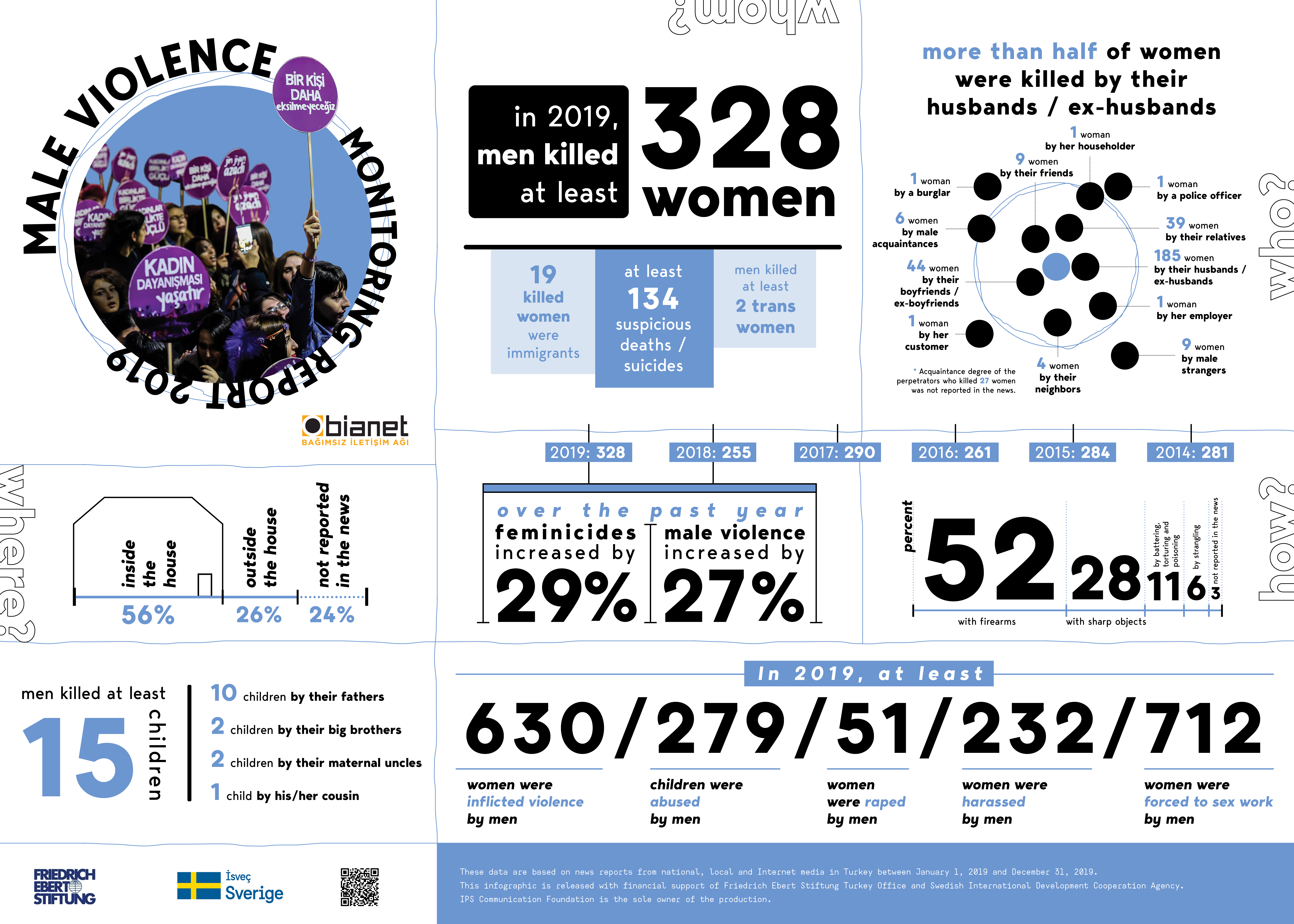 Ege Öztokat browsed the media and Evrim Kepenek penned the 2019 Male Violence Monitoring Report. Beste Yamalıoğlu and Salih Gürkan Çakar prepared the poster and video of the male violence monitoring report. Photojournalist Yasin Akgün captured the photo on the infographic.