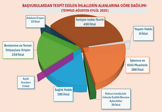 Raporda, İHD'ye Temmuz'da 18, Ağustos'ta 15, Eylül'de 26 olmak üzere cezaevlerinden toplam 59 başvurunun yapıldığı kaydedildi.
