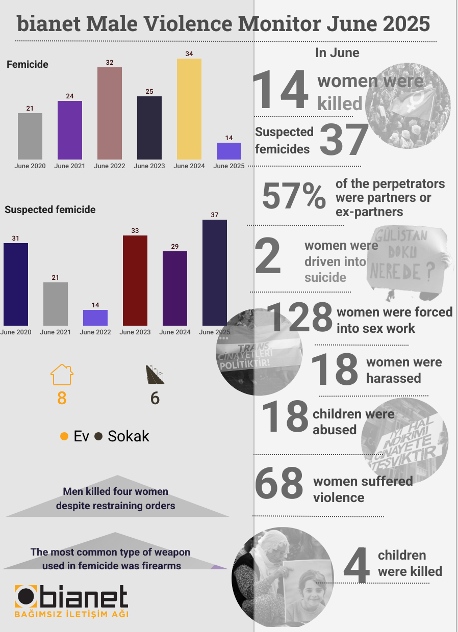 According to news compiled by bianet from local and national newspapers, news sites, and agencies, men killed at least 14 women and four children in June.