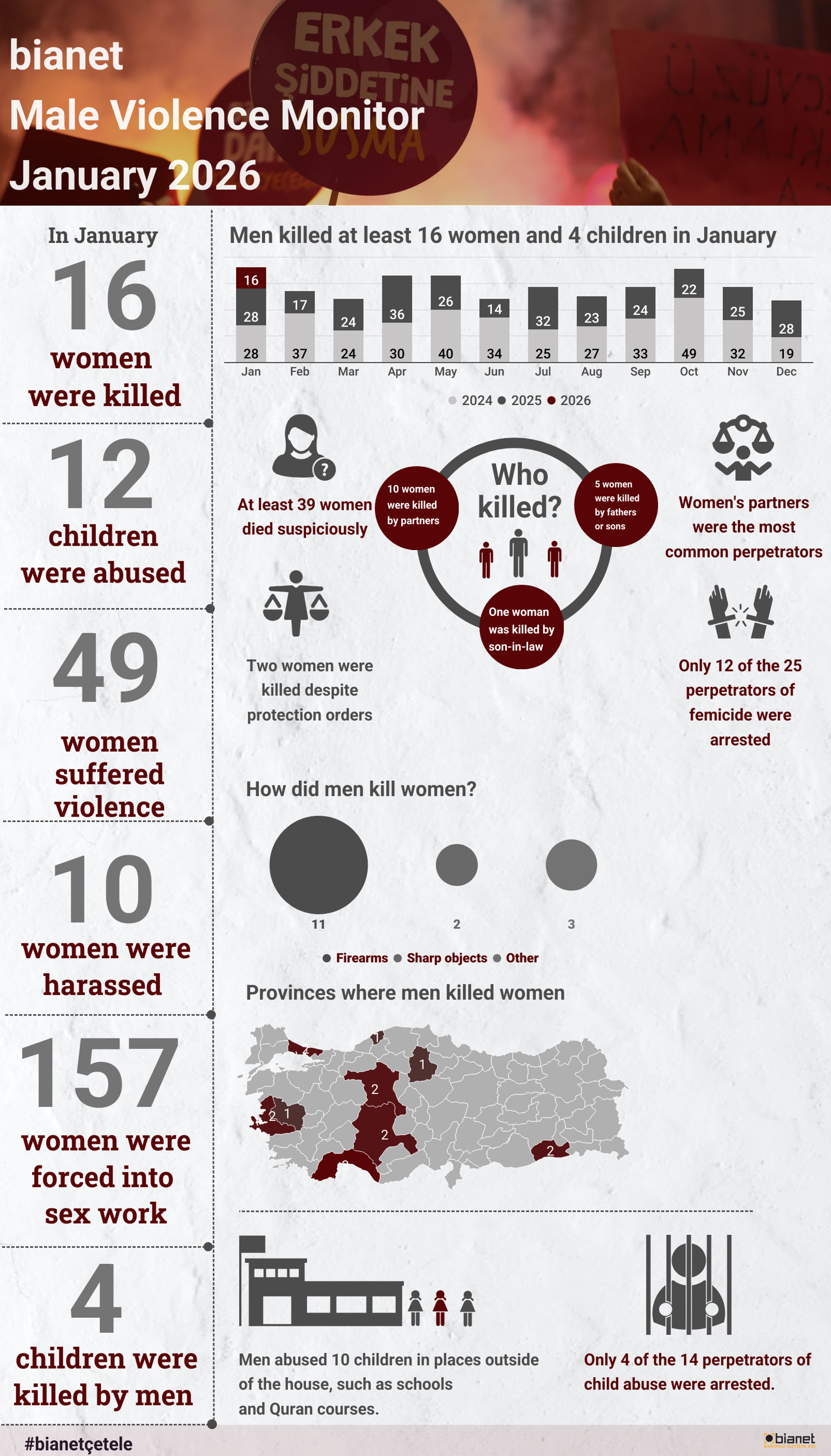 According to news compiled by bianet from local and national newspapers, news sites, and agencies, men killed at least 16 women and 4 children in January 2026.