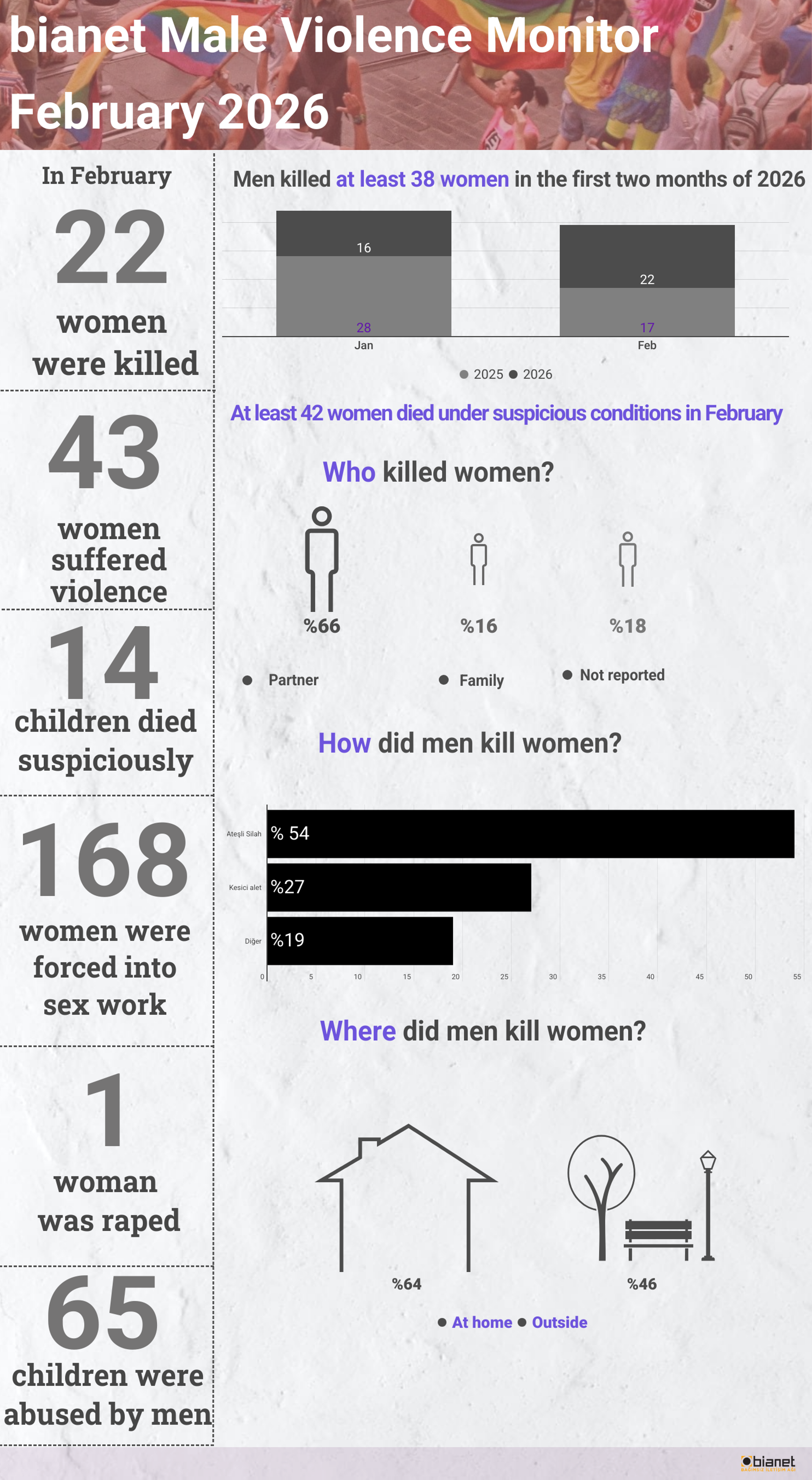 According to news compiled by bianet from local and national newspapers, news websites, and agencies, men killed at least 22 women and one child in Feb 2026.