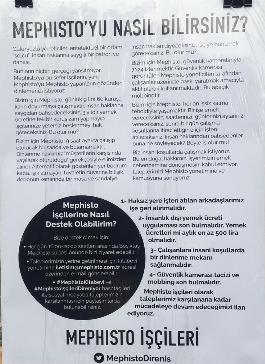 İşten çıkarılmadan önce bazı müdürler dâhil tüm Mephisto çalışanlarının altına imza attığı bir dilekçeyle belirttikleri talepleri yineliyorlar: Yemek ücreti olan günlük 9,60 TL’nin arttırılması, sağlıklı bir dinlenme alanı, mobbing ve kamera tacizinin son bulması, haksız yere işten çıkarılan arkadaşlarının işe alınması. 2 Şubat günü çalışan arkadaşlarının da katıldığı bir basın açıklamasıyla eyleme başladılar.