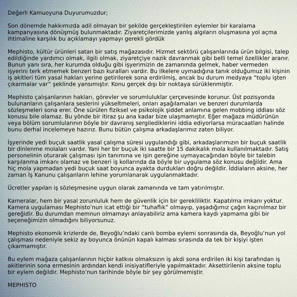 Mephisto yönetimi tarafından çalışanların işten çıkarılma nedenlerine de cevap verilen açıklamada, çalışanlardan nazik olmaları, işe saatinde gelmeleri haber vermeden iş yerini terk etmemeleri gibi özelliklerin arandığı ve bu özelliklerin olmadığı düşünülen iki işçinin tüm hakları teslim edilerek işten çıkarıldıkları ve diğer çalışanların bu eylemde hiçbir katkısı olmadığı ifade edildi.