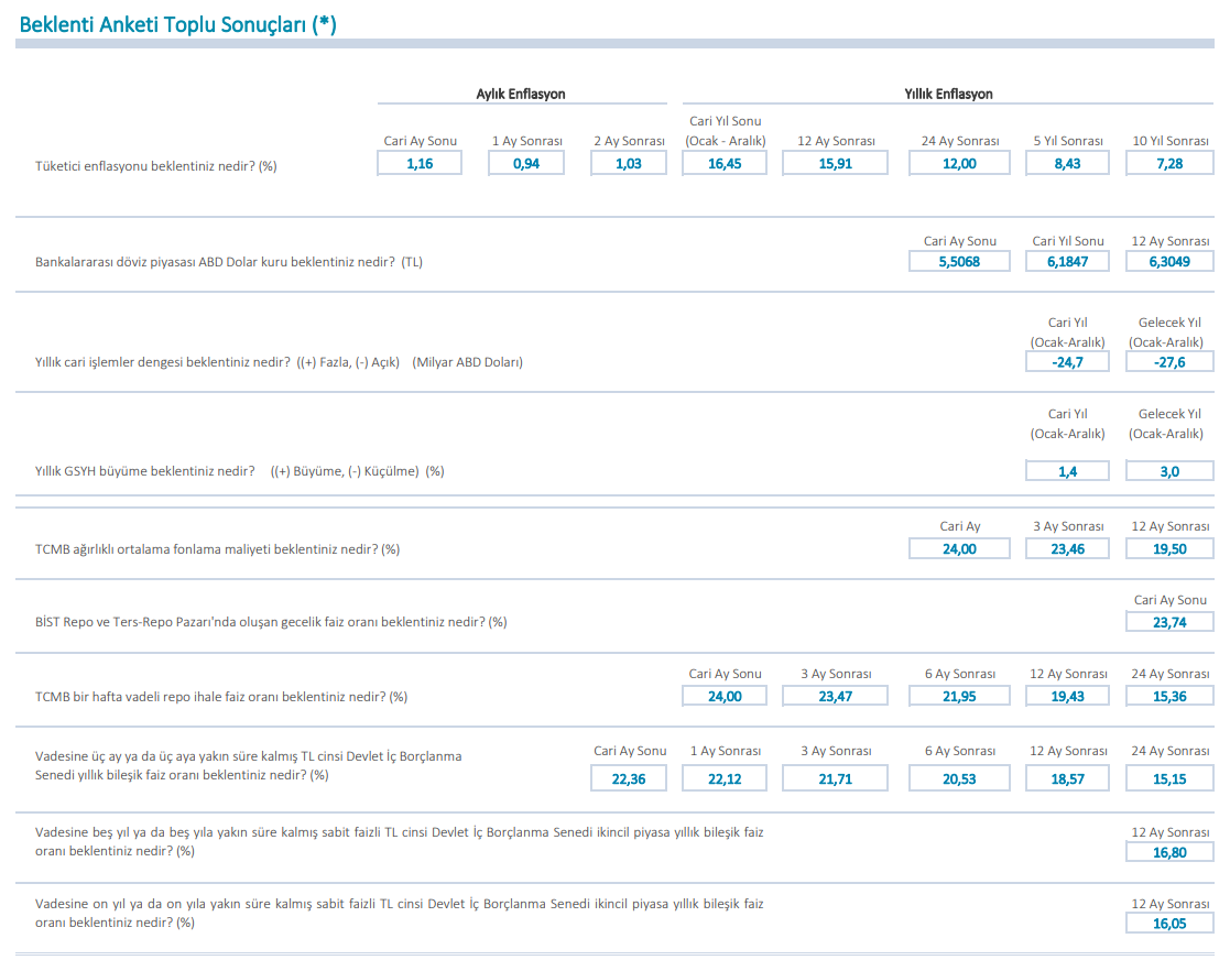 Merkez Bankası (MB) Ocak ayı 'beklenti anketi' sonuçları açıkladı. Reel sektör ve finansal sektör temsilcileri ile profesyonellerden oluşan 75 katılımcı tarafından oluşturulan anket sonucuna göre yıl sonu dolar kuru beklentisi 6,18 iken yıllık enflasyon 15,91.