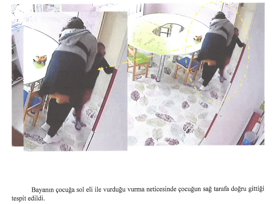 M.K.’nin ise uyutmaya çalıştığı çocuklara vurduğu, ayaklarından tutarak çektiği, havaya kaldırarak sert bir biçimde yatağa attığı ve çocuğun üzerini tamamen örterek iki eli ile kafasına yorganla baskı yaptığı belirtildi. Yine raporda kimliği tespit edilemeyen bir öğretmenin çocuğa tokat attığı da ifade edilirken, H. K'nin ise çocuğu tersten tutup yürüterek dışarı çıkarttığı kaydedildi.