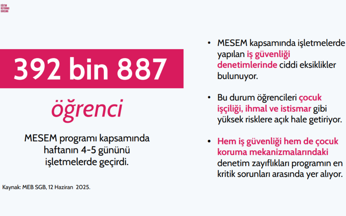 Eğitim Reformu Girişimi'nin (ERG) 2025 Eğitim İzleme Raporu'na göre, 2024-2025 eğitim-öğretim yılında 15-18 yaş grubunda MESEM'e devam eden öğrenci sayısı 392 bin 887 oldu. Öğrenciler asgari ücretin belli bir oranı kadar ücret alıyor ancak emeklilik primleri yatmıyor; işyerlerindeki çalışma koşulları büyük ölçüde patronların insafına bırakılıyor.