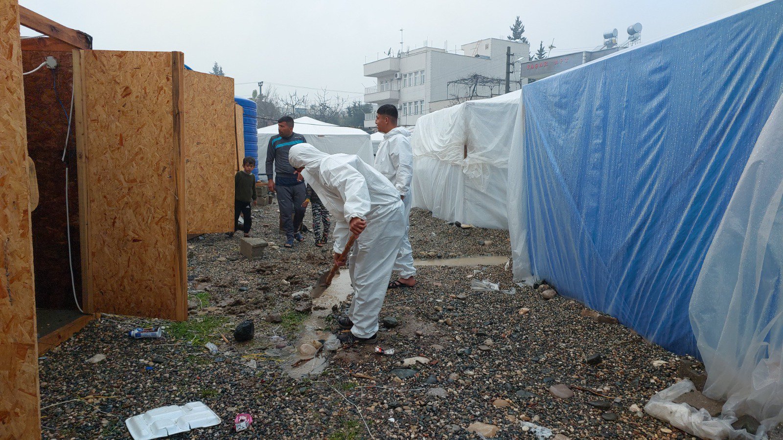 Li taxa Sumerevlerê ya Semsûrê konên ku ji bo mexdûran hatine danîn, di bin avê de mane. Mexdûrên erdhejê, bi xwe cihokan vedikin da ku av nekeve nava konan.