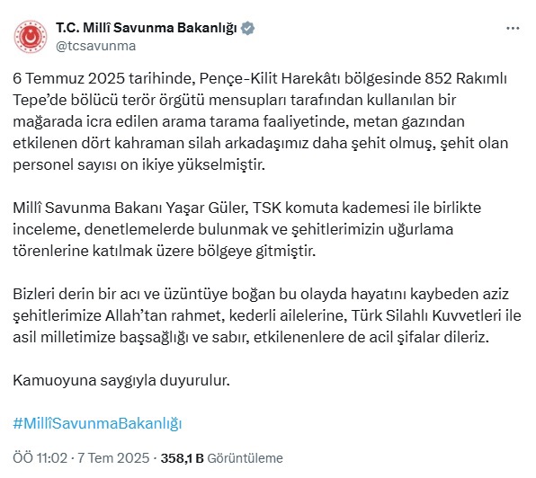 “Devam eden arama faaliyetleri kapsamında; Pençe-Kilit Harekât bölgesinde bulunan, önceden hastane maksadıyla kullanıldığı bilinen, teröristlerden temizlenmiş olan 852 rakımlı tepedeki bir mağarada 6 Temmuz 2025 tarihinde yapılan arama-tarama faaliyeti sırasında 19 personelimiz metan gazına maruz kalmış, derhâl hastaneye sevk edilmiş; yapılan tüm müdahalelere rağmen beş kahraman personelimiz şehit olmuştur.”