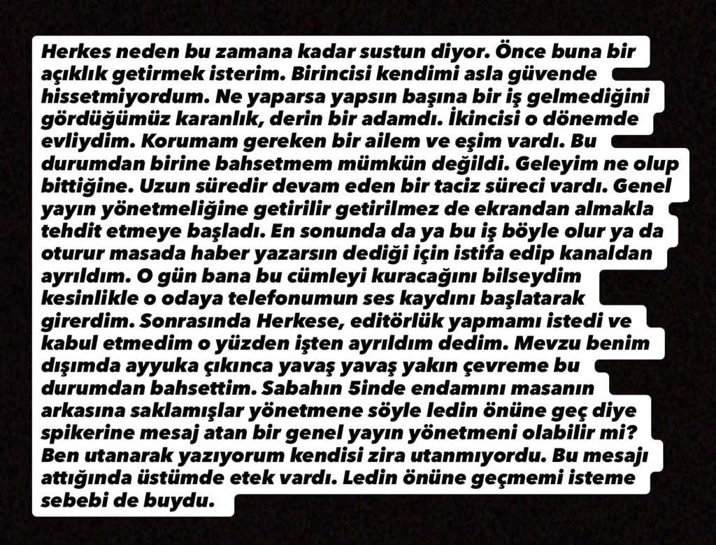 Uzun süredir devam eden bir taciz süreci vardı. Genel yayın yönetmeliğine getirilir getirilmez de ekrandan almakla tehdit etmeye başladı. En sonunda da ya bu iş böyle olur ya da oturur masada haber yazarsın dediği için istifa edip kanaldan ayrıldım. O gün bana bu cümleyi kuracağını bilseydim kesinlikle o odaya telefonumun ses kaydını başlatarak girerdim.