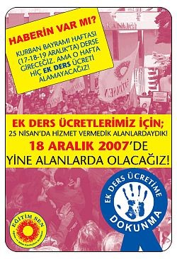 Öğretmenler karar gereğinde Salı günü (18 Aralık 2007) ek ders ücretlerinin haksız yere kesintiye uğramasına ve AKP hükümetinin eğitim alanına politikalarına karşı sevk alarak iş bırakıp okulları boşaltacak. (EZÖ/TK)